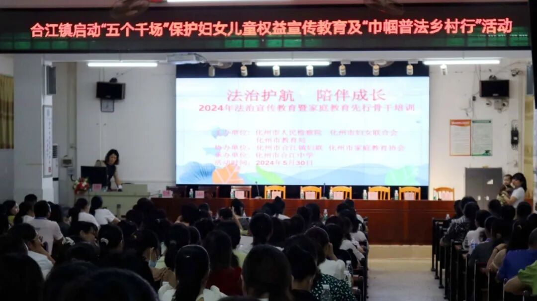 与此同时,化州市人民检察院与化州市妇女联合会在化州市合江中学也联合举办了主题为“法治护航,陪伴成长”的2024年法治宣传教育暨家庭教育先行骨干培训活动。活动中,检察干警以现场的法治宣讲展板为切入,向家庭教育先行骨干讲解了《未成年人保护法》《预防未成年人犯罪法》《家庭教育促进法》及地区典型案例。化州市妇联主席李晓丹向现场的家长们分享了家庭教育知识和事例,并由家庭教育老师曾伟红向在场的家长授课。化州市人民检察院党组成员、副检察长黄宇表示,家庭教育对孩子的成长尤为重要,教育孩子是社会共同的责任,市检察院会一如既往地加强与市教育部门、市妇联联动合作,与家长一起共同做好未成年人保护工作。